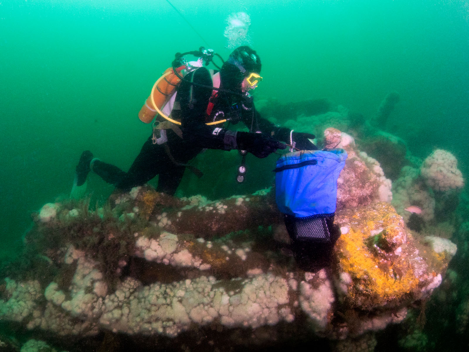 Harry Roecker maps the Robert J. Walker, sunk on June 21, 1860 in the Atlantic Ocean approximately ten miles off the coast of Atlantic City, New Jersey, USA. The ship collided with a commercial schooner. The ship sunk within an hour and 20 of the 66 crew members died. The RJ Walker is an iron-hulled steam paddle wheeler, 132' long and now lies in 90' of water. The photo was taken as part of the Robert J. Walker Shipwreck Mapping Project.