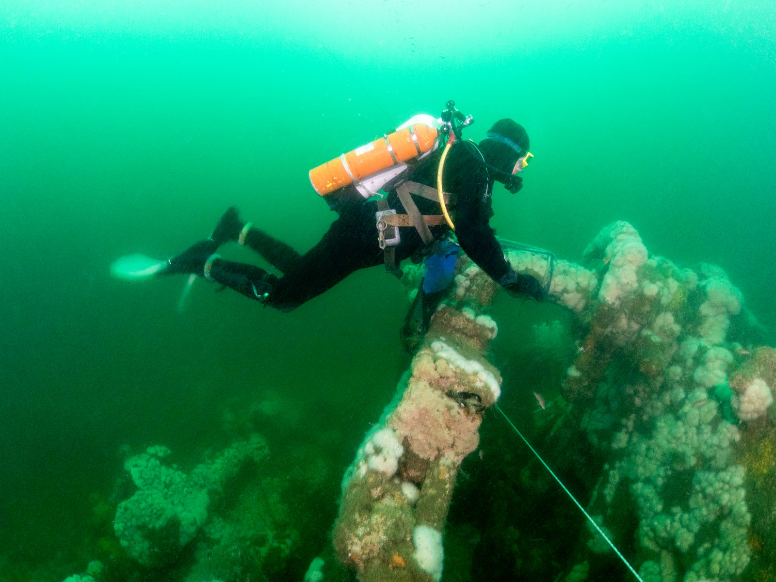 Dan Lieb maps the Robert J. Walker, sunk on June 21, 1860 in the Atlantic Ocean approximately ten miles off the coast of Atlantic City, New Jersey, USA. The ship collided with a commercial schooner. The ship sunk within an hour and 20 of the 66 crew members died. The RJ Walker is an iron-hulled steam paddle wheeler, 132' long and now lies in 90' of water. The photo was taken as part of the Robert J. Walker Shipwreck Mapping Project.