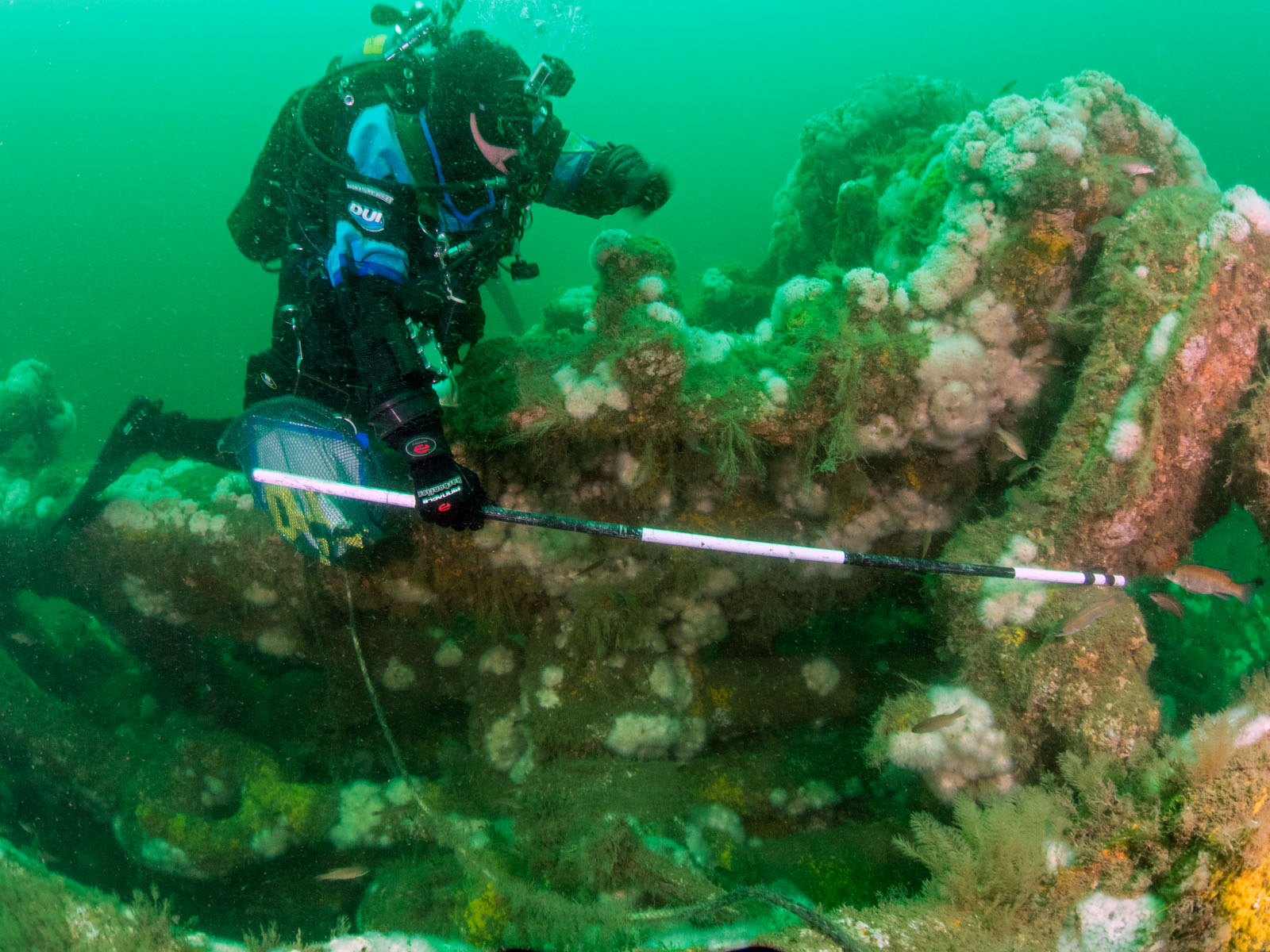 Joyce Steinmetz uses a metered pole to take measurements on the Robert J. Walker, sunk on June 21, 1860 in the Atlantic Ocean approximately ten miles off the coast of Atlantic City, New Jersey, USA. The ship collided with a commercial schooner. The ship sunk within an hour and 20 of the 66 crew members died. The RJ Walker is an iron-hulled steam paddle wheeler, 132' long and now lies in 90' of water. The photo was taken as part of the Robert J. Walker Shipwreck Mapping Project.