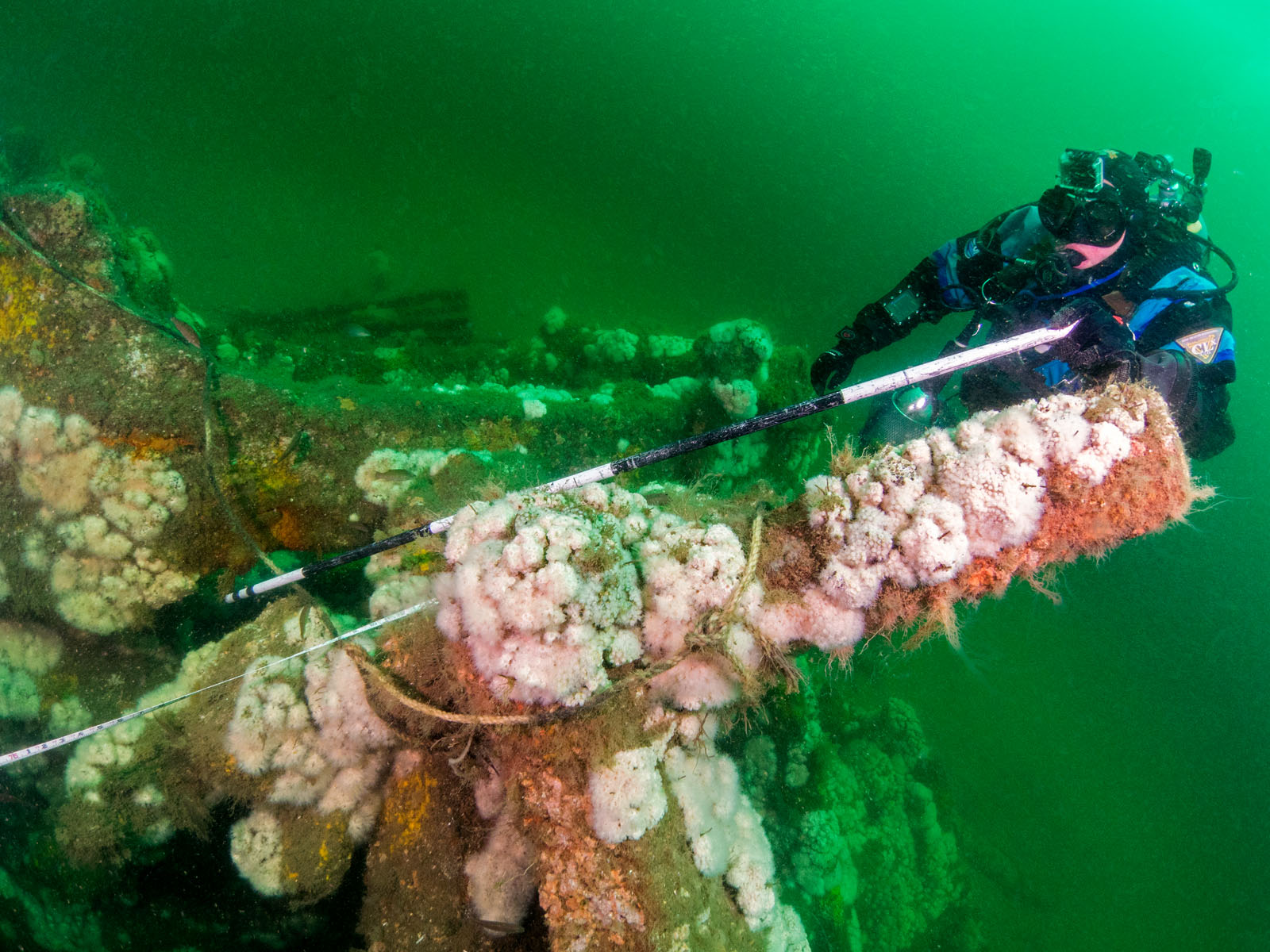 Joyce Steinmetz uses a metered pole to take measurements on the Robert J. Walker, sunk on June 21, 1860 in the Atlantic Ocean approximately ten miles off the coast of Atlantic City, New Jersey, USA. The ship collided with a commercial schooner. The ship sunk within an hour and 20 of the 66 crew members died. The RJ Walker is an iron-hulled steam paddle wheeler, 132' long and now lies in 90' of water. The photo was taken as part of the Robert J. Walker Shipwreck Mapping Project.