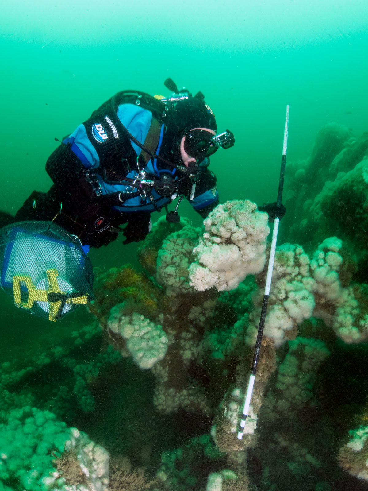 Joyce Steinmetz uses a metered pole to take measurements on the Robert J. Walker, sunk on June 21, 1860 in the Atlantic Ocean approximately ten miles off the coast of Atlantic City, New Jersey, USA. The ship collided with a commercial schooner. The ship sunk within an hour and 20 of the 66 crew members died. The RJ Walker is an iron-hulled steam paddle wheeler, 132' long and now lies in 90' of water. The photo was taken as part of the Robert J. Walker Shipwreck Mapping Project.
