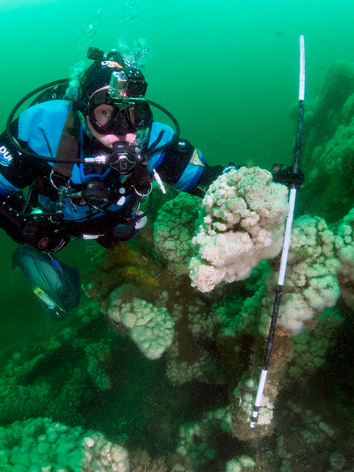 Joyce Steinmetz uses a metered pole to take measurements on the Robert J. Walker, sunk on June 21, 1860 in the Atlantic Ocean approximately ten miles off the coast of Atlantic City, New Jersey, USA. The ship collided with a commercial schooner. The ship sunk within an hour and 20 of the 66 crew members died. The RJ Walker is an iron-hulled steam paddle wheeler, 132' long and now lies in 90' of water. The photo was taken as part of the Robert J. Walker Shipwreck Mapping Project.