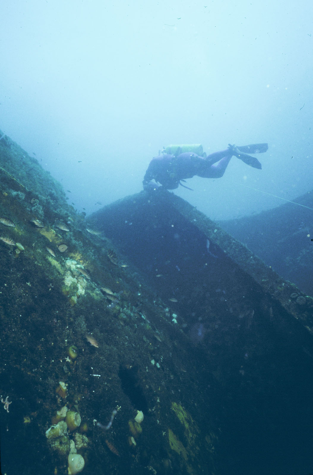 This tanker was cut in two when she collided with the Israeli Passenger Liner SHALOM on Thanksgiving Day in 1964. Her bow section was later salvaged and had a new stern and engine added. The renovated ship continued to sail until a few years ago. The 150 foot stern section sank. She rests on her starboard side with a 30 degree list. It is possible to swim into many parts of the wreck quite easily and safely. The Stolt Dagali lies in 130' of water and rises 60 feet off the bottom. The Stolt Dagali was a 582' long tanker built in 1955. She was powered by a diesel oil engine.